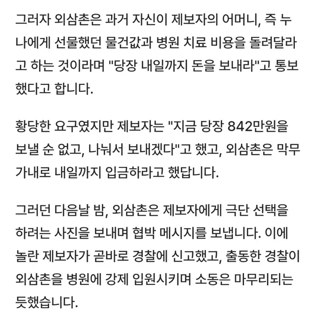 2천만원 거절하자 이번엔 누나도와준 값 갚아라고 자살소동 일으키며 800만원가량 요구.