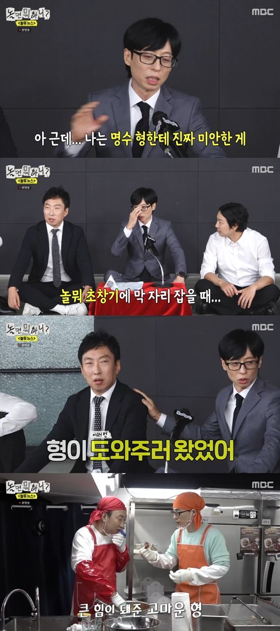 유재석은 "사실 '놀뭐' 초창기에 확실히 자리를 못 잡았을 때 형이 도와주러 왔었다. 내가 방송 나가고 형한테 미안하다고 했다. (방송에서) 형이 농담 삼아 '너 혼자 하면 안 돼 같이 하자' 하니까, 형이 마치 여기 (프로그램에) 끼어들려는 것처럼 (나왔다)"라며 박명수에게 미안했던 일화를 공개했다.