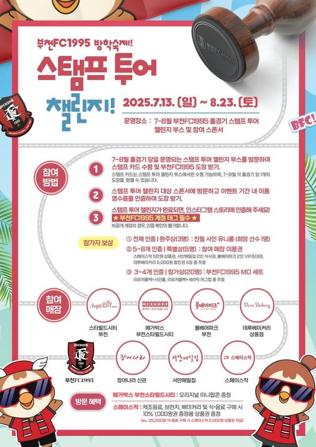 [인터풋볼] 신동훈 기자 = 부천FC1995(구단주 조용익 부천시장, 이하 부천)가 여름을 맞아 팬들을 위해 스폰서와 함께하는 ‘부천FC1995 방학숙제 스탬프 투어 챌린지’를 진행한다.