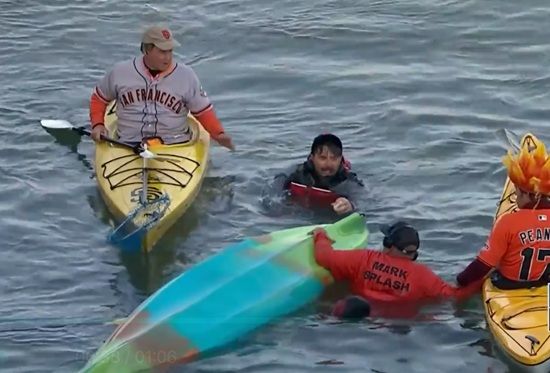 현지 중계 화면에선 오타니의 홈런 타구를 두고 바다로 뛰어든 한 남자가 공을 낚아채는 장면이 나왔다.