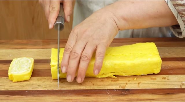 프라이팬에 기름을 넉넉하게 둘러 팬에 잘 코팅해야 한다. 팬이 살짝 따뜻해지면 불을 최대한 줄이고 계란 흰자 혼합물을 붓는다. 센 불에서 조리하면 흰자가 너무 빨리 탈 수 있기 때문이다. 흰자 혼합물이 완전히 익기 전에 말아줘야 나중에 썰었을 때 부서지지 않는다.
