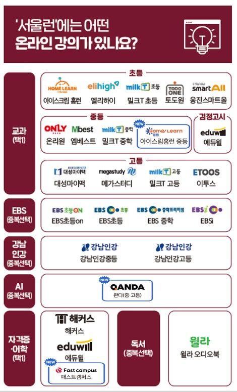 뉴시스 보도에 따르면, 13일 시에 따르면 7월 1일부터 서울런 회원들은 기존 22개에서 24개로 확대된 학습사이트에서 유명 강사의 인강을 무료·무제한으로 수강할 수 있게 됐다. 새롭게 추가되는 ▲아이스크림홈런 중등(교과)과 ▲패스트캠퍼스(비교과)를 통해 중학생부터 대학생까지 각자의 학습 수준과 진로 목표에 맞는 맞춤형 콘텐츠를 선택할 수 있다.