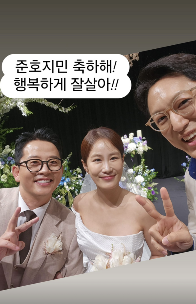 한석준은 13일 자신의 SNS에 김준호 김지민의 예식 현장에서 찍은 사진을 게재했다. 그는 “준호 지민 축하해! 행복하게 잘 살아”라는 글과 함께 셀카를 공개했다. 사진 속 신랑 신부는 행복한 미소를 짓고 있다.