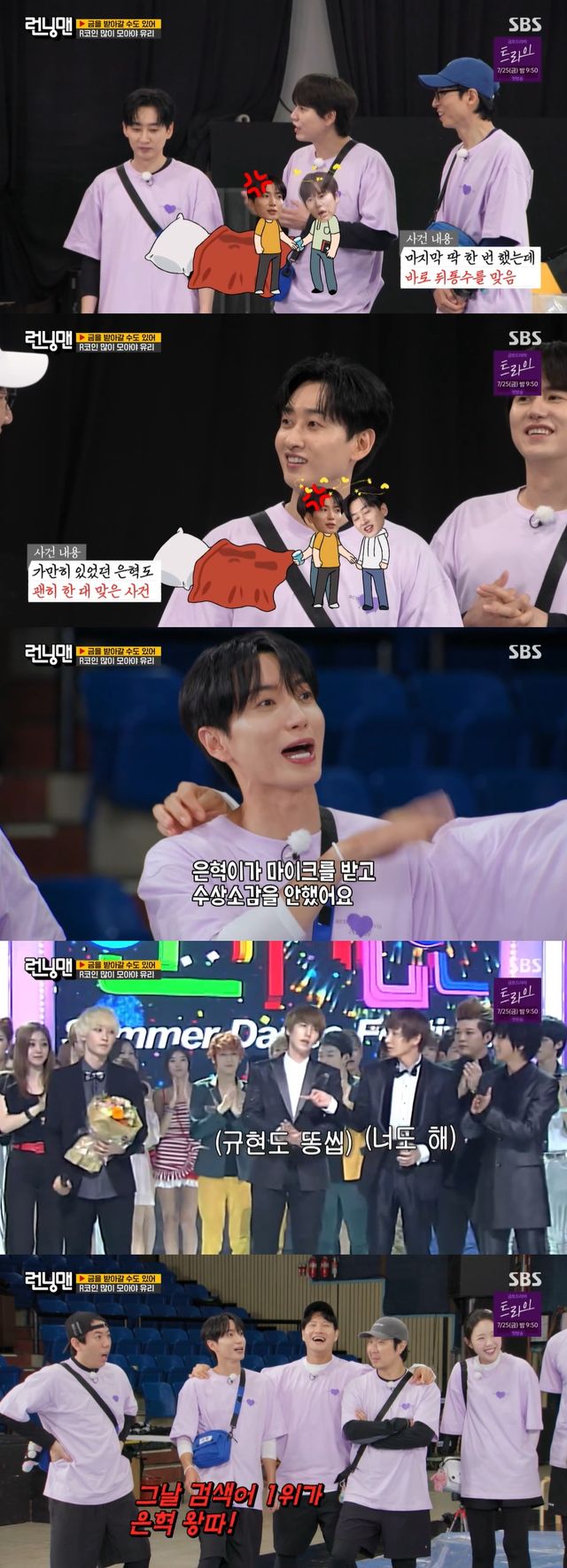 이어 은혁은 "심지어 저는 아무것도 안 하고 가만히 있었는데 '너지' 하면서 뒤통수를 맞았다"라고 털어놨다. 이를 들은 유재석은 "리더가 조금 자제력이 없으시네"라고 말했다.