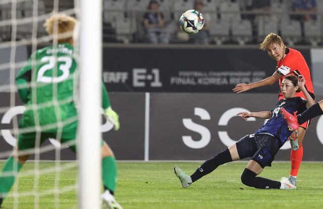 전반 20분 한국이 실점 위기를 가까스로 벗어났다. 이금민이 후방에서 순간 두 명에게 둘러싸여 볼을 빼앗겼고, 일본 최전방 공격수 요시다의 슈팅이 골대 옆으로 살짝 벗어났다.