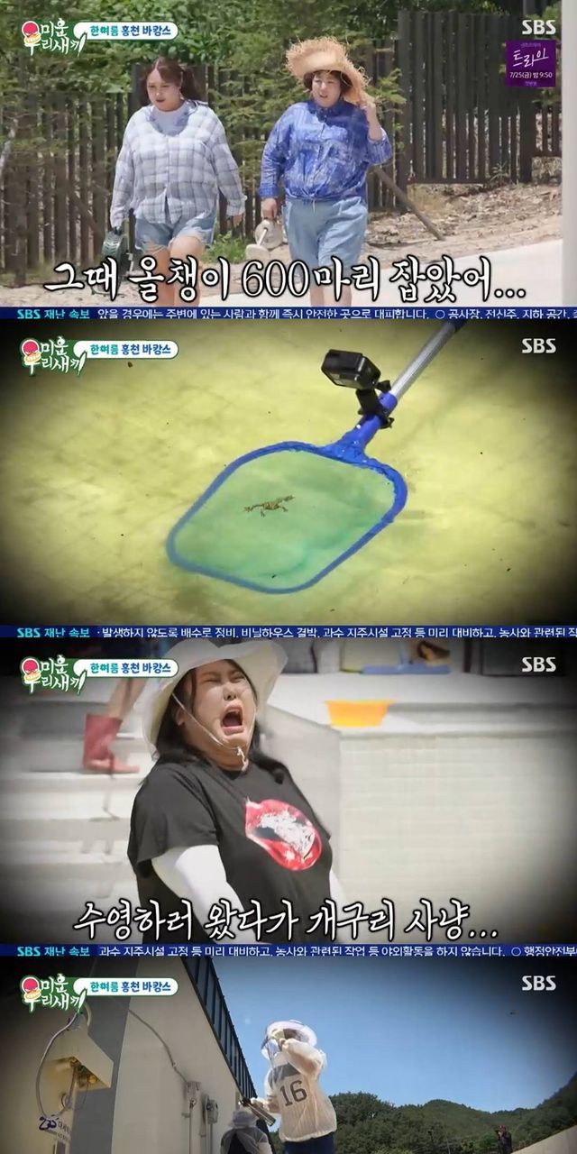 이날 방송에서 신기루는 풍자에게 "여름의 시작을 여기서 한다니까 너무 좋은데?"라며 들뜬 마음을 이야기했다. 이어 신기루는 "너 여기 수영장 청소했잖아"라고 말해 웃음을 자아냈다. 풍자는 "말해 뭐 하냐. 여기서 올챙이 600마리 잡았다"라고 말해 눈길을 끌었다. 지난해 풍자는 홍천 별장을 청소하며 올챙이가 가득한 수영장 청소를 이어간 바 있다.