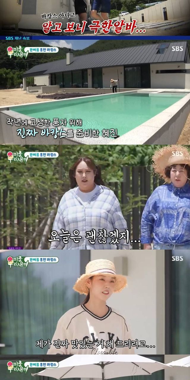 풍자는 "내가 여기서 올챙이 600마리 잡았다니까"라고 말했다. 수영장을 보며 신기루, 풍자가 바로 들어가면 되냐고 묻자 "올해 첫 개장이다"라고 이야기해 기대감을 높였다. 곧이어 한혜진은 벽돌을 가져와 의아함을 자아냈고, 풍자는 "집을 또 지을 거야?"라고 물었다. 이에 한혜진은 "피자 화덕을 만들 거다"라고 이야기했다. 무더위에 화덕피자를 만들 거라는 얘기에 풍자는 "전자레인지에 돌리면 되잖아"라고 했고, 한혜진은 "낭만이 없잖아"라고 이야기해 웃음을 더했다.