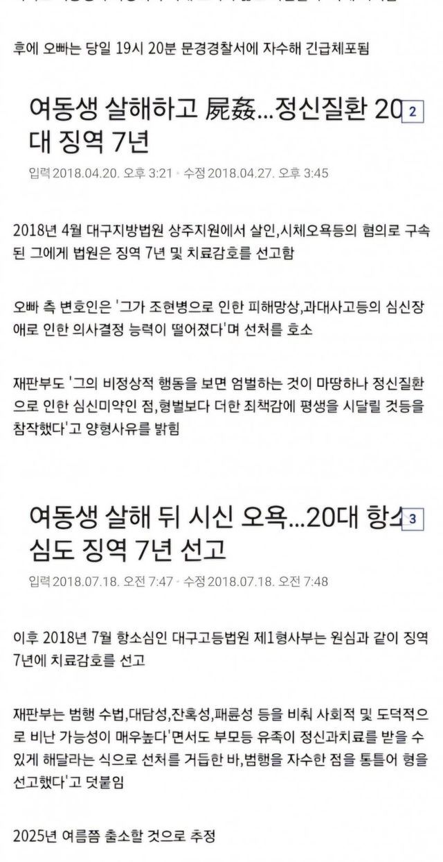 1. 24살 조현병 환자가 21살 여동생을 살해하고 동생의 시신을 시간(屍姦)함