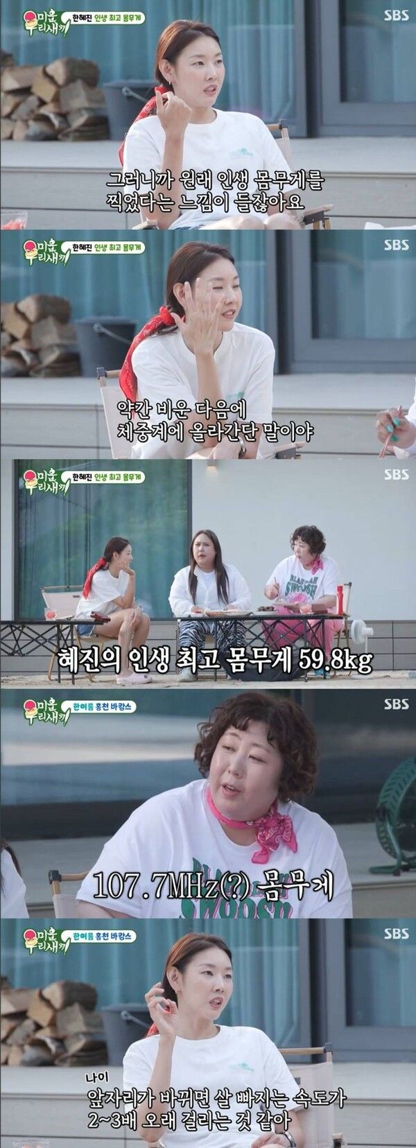 이어진 대화에서 한혜진은 "우리는 생계야"라고 말했고, 풍자 또한 "우리도 생계야"라고 응수하며 직업적 공감대를 형성했다. 한혜진이 신기루와 풍자에게 "둘의 리즈 시절 몸무게는 뭐냐"고 묻자, 신기루는 "107.7kg"라고 이야기하며 "그때보다 많이 높진 않다"고 답했다. 이에 한혜진은 "그때부터 지금까지 20년 넘게 유지하는 거냐"고 물었고, 신기루는 "지금은 더 쪘다"고 솔직하게 답해 웃음을 더했다.