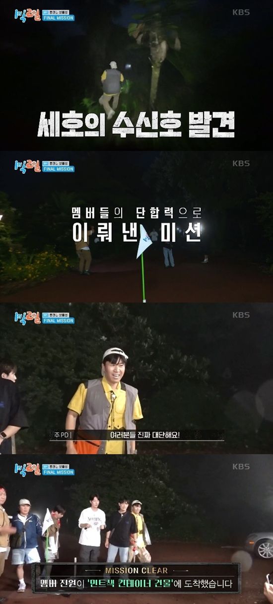 길을 잃은 상태였던 김종민은 멤버들의 수신호를 발견, 딘딘을 만난 뒤 민트색 컨테이너로 올 수 있었다.
