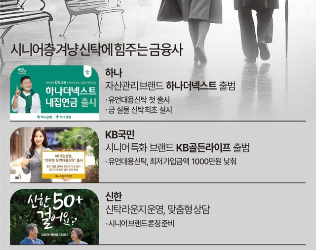 금융사들이 초고령화 사회에 진입한 국내의 시니어층을 겨냥해 ‘신탁 전쟁’을 벌이고 있다. ‘시니어 1000만 시대’를 맞아 자산 관리와 처분을 금융기관에 맡기는 수요가 증가하면서다. 부동산과 유언대용신탁은 물론이고 금 실물 신탁 상품까지 출시하면서 관심을 끌고 있다.