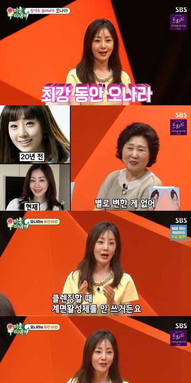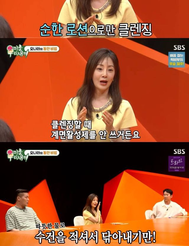 동안 미모를 유지하는 비법이 수건 한 장이라고. 오나라는 "비법은 피부과 열심히 다니는 거고"라며 솔직 입담을 뽐내며 "유지하려면 습관이 중요하지 않냐. 저는 클렌징할 때 계면활성제를 안 쓴다. 순한 로션으로 클렌징을 하는 거다. 수건에 따뜻한 물을 적셔서 닦아내는 거다. 2년째 하고 있는데 피부가 땅기지 않고 좋더라"라며 의외의 비법을 밝혔다.