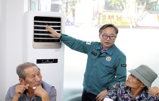 | ▲ 유성훈 금천구청장이 어르신 쉼터를 찾아 에어컨을 점검하고 있다. |