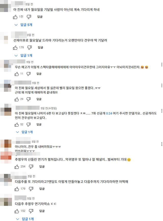 '견우와 선녀' 7회 예고편 댓글을 통해 많은 시청자들은 "진짜 월요일을 기다릴 사람이 아닌데 계속 기다리게 하네", "선재 이후로 월요일을 기다리게 하는 드라마 오랜만', "무슨 예고가 이렇게 스펙터클해", "월요일이 제일 싫은데 월요일 빨리 왔으면 좋겠다", "월요일에 나머지 6편 다 보고 싶다. 못 참겠다" 등 뜨거운 반응을 보이고 있다.
