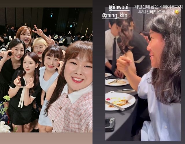 김준호와 김지민의 결혼식인 만큼, 웃음도 있었다. 특히 김승혜의 옆자리에는 개그맨 임우일이 자리해 깨알같은 웃음을 전했다. 김승혜는 "허민 선배 남은 스테이크까지 우일 선배 입으로"라는 글로 임우일의 남다른 먹성을 전했다.