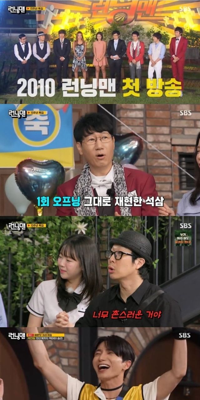 한편, 이날 레이스에는 슈퍼주니어 이특, 규현, 은혁도 데뷔 해인 2005년 당시 입었던 착장으로 함께 하며 ‘런닝맨’ 방송 15주년을 축하했다. 본격적인 레이스는 재석 팀, 석진 팀으로 나뉘어 돌입했고 첫 게임은 ‘매운맛 의리게임’이었다.