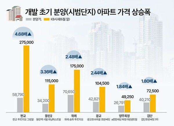신도시 개발 초기 단계에 들어서는 첫 시범아파트 가격이 분양가 대비 적게는 1.8배, 많게는 4.68배 증가한 것으로 나타났다.