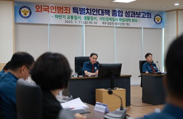 제주경찰청은 지난 11일 탐라상방에서 경찰서장 등 각급 지휘부가 참석한 가운데 '외국인범죄 특별치안대책 성과보고회'와 '3대 기초질서 확립 대책회의'를 개최, 상반기 성과를 점검하는 한편, 하반기 중점적으로 추진할 사업 방향에 대해 논의했다. 제주경찰청 제공