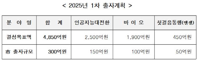 이에 조성 3년차인 올해 첫 출자사업은 △미래 혁신의 핵심인 AI 분야 투자 강화를 위해 신설한 ‘인공지능대전환’ △시장 침체로 신속한 투자지원이 필요한 ‘바이오’ △상대적으로 자금 확보에 어려움을 겪는 초기창업기업을 지원하는 ‘첫걸음동행(엔젤)’ 분야 등에 총 300억 원을 우선 출자한다.