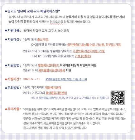 경기도가 오는 21일부터 ‘영유아 교재·교구 배달 서비스’ 2차 신청 접수를 시작한다. 지난 5월 1차 신청 접수를 통해 6월 중 0~35개월 영유아 가정 4,151가구에 첫 교재·교구를 전달한 데 이은 후속 지원이다.