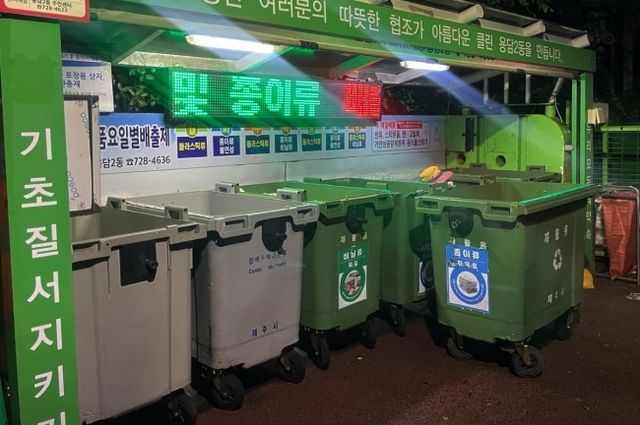 제주도 전역에 호우주의보가 내려졌던 지난 13일 저녁 제주시 용담2동의 한 클린하우스. 4년 차 클린하우스 도우미 고임선(70)씨는 쓰레기 수거함들 사이에 간이의자를 두고서 비를 피하고 있었다.