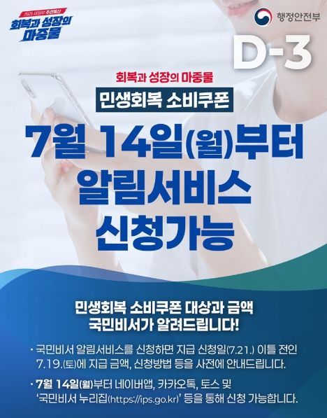 · 7월 14일(월)부터 네이버앱, 카카오톡, 토스 및 '국민비서 누리집' 등을 통해 신청 가능합니다.