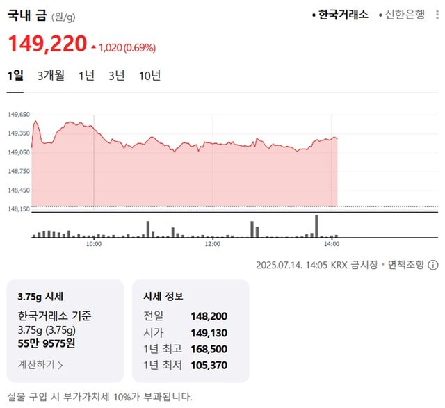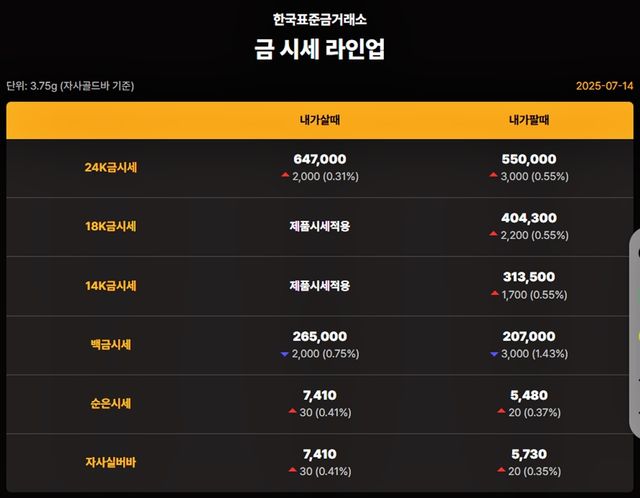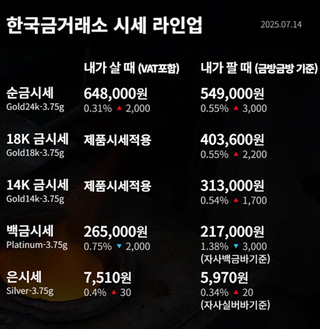 국내 금시세(금값)가 14일(한국 시각) 오후 상승세(전 거래일 대비)를 보이고 있다.