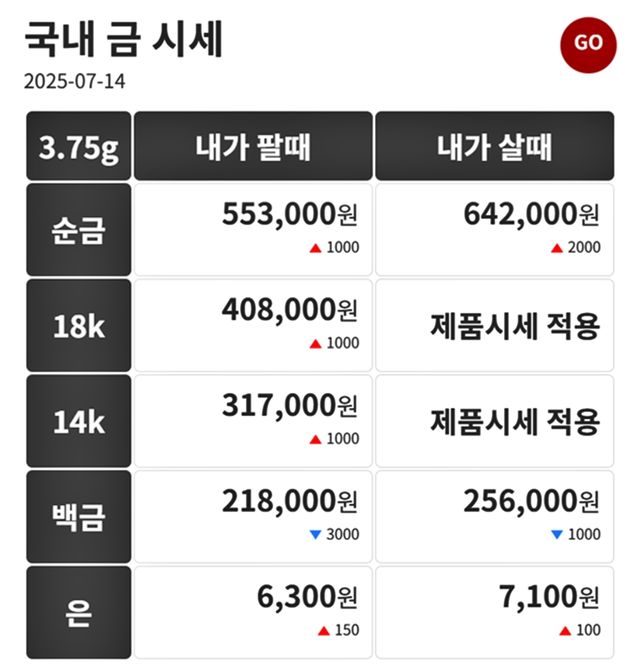 순금(24K) : 매입가 64만 2000원 / 매도가 55만 3000원