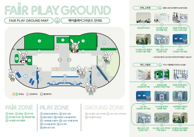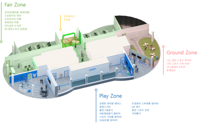 Fair 존은 공정한 원칙을 배우는 공간이다. 도핑의 역사와 실제 사례, 금지약물의 종류와 위험성을 VR 등 디지털 콘텐츠로 체험하며 배울 수 있다. Play 존은 즐거운 신체활동으로 배우는 곳이다. 틀린 그림 찾기, 시료채취용기 챌린지 등 놀이기반 체험 프로그램으로 도핑방지 개념을 습득할 수 있다. Ground 존은 다짐과 소통으로 성장하는 공간이다. 클린 스포츠 키링 만들기, 클린스포츠 선언 등 방문자가 직접 참여하며 공정한 스포츠의 의미를 직접 실천해 보는 곳이다.