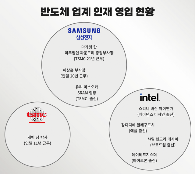 최근 글로벌 반도체 패권을 두고 벌어지는 삼성전자, TSMC, 인텔의 인재 전쟁이 더욱 치열해지면서 반도체업계에선 각 기업에 몸담고 있는 임원의 인사 이동에 촉각을 곤두세우고 있다. 특히 인공지능(AI) 시대에 접어들며 반도체 수요와 기술 난이도가 상승하는 만큼 업계 내 예상치 못한 이직과 영입이 잇따르고 있다.