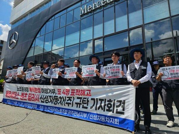 뉴시스 보도에 따르면, 금속노조 광주지부가 조합원을 잇따라 해고한 지역 메르세데스-벤츠코리아 딜러사(신성자동차)를 규탄하고 나섰다.
