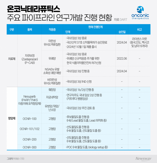 14일 업계에 따르면 온코닉테라퓨틱스는 합성치사 유발 DNA 손상 복구 저해기전 이중표적항암제 '네수파립'과 합성치사 DDR 계통 항암신약 이중표적항암제 ▲OCNR-100 ▲OCNR-101/102 ▲OCNR-200 ▲OCNR-300 등의 항암 신약 후보물질들을 연구 중이다.