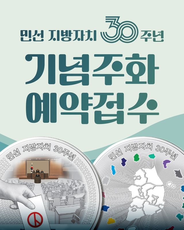 한국조폐공사는 전국동시지방선거 실시 30주년을 기념해 발행하는 ‘민선 지방자치 30주년 기념주화’ 예약 접수를 7월 14일부터 8월 1일까지 실시한다고 밝혔다.