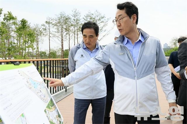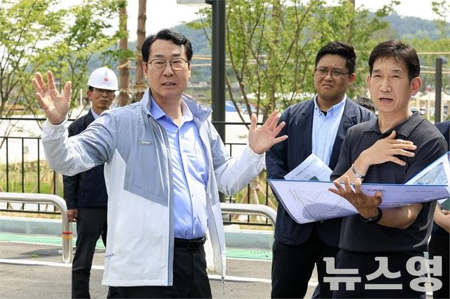 정명근 화성특례시장이 동탄패밀리풀 문화공원 현장을 점검하고 있다./사진=화성시
