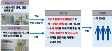 또한, A씨는 구매자들이 스테로이드 복용 시 발생하는 부작용을 줄이기 위해 함께 복용하는 국내 허가 전문의약품(간기능 개선제 등)을 3,000만원 상당도 함께 판매했다.