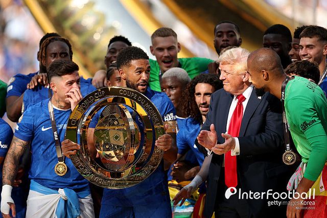 [인터풋볼] 김진혁 기자 = 첼시의 우승 세레머니 중 축구 팬들의 시선을 강탈한 한 인물이 있었다. 바로 도널드 트럼프 미국 대통령. 그는 첼시 선수단과 함께 트로피 세레머니를 즐겼다.
