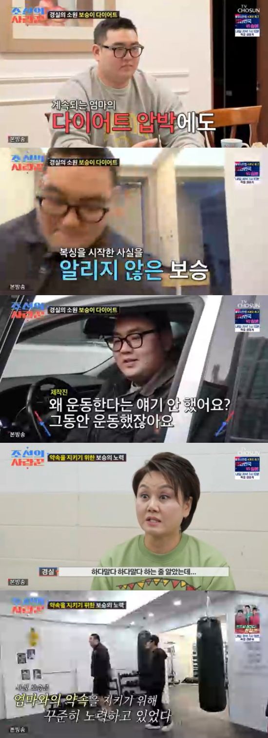 이경실은 "제가 예전에 보승이를 받아들일 때 '가장으로서 자세가 되어 있으려면 너의 건강을 지켜야 된다. 넌 이제 아빠니까 아빠로서 건강한 몸을 유지해라' 이런 이야기를 했었는데 그동안 봤을 땐 몸무게가 별로 변화가 없는 거 같아서 하다말다 하다말다 한 거 같다 그런 생각이 들었는데 '권투로 다져진 몸이었구나'라는 생각이 드니까 기특하고 대견하고 믿음이 간다"라며 감탄했다. 제작진은 "인정해 주시는 거냐"라며 질문했고, 이경실은 "보승이 인정"라며 못박았다.