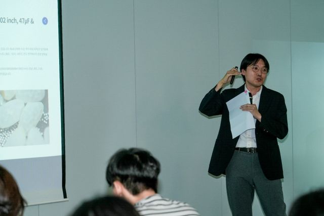 이민곤 MLCC 개발팀 상무가 제품학습회를 진행하고 있다. (사진제공=삼성전기)