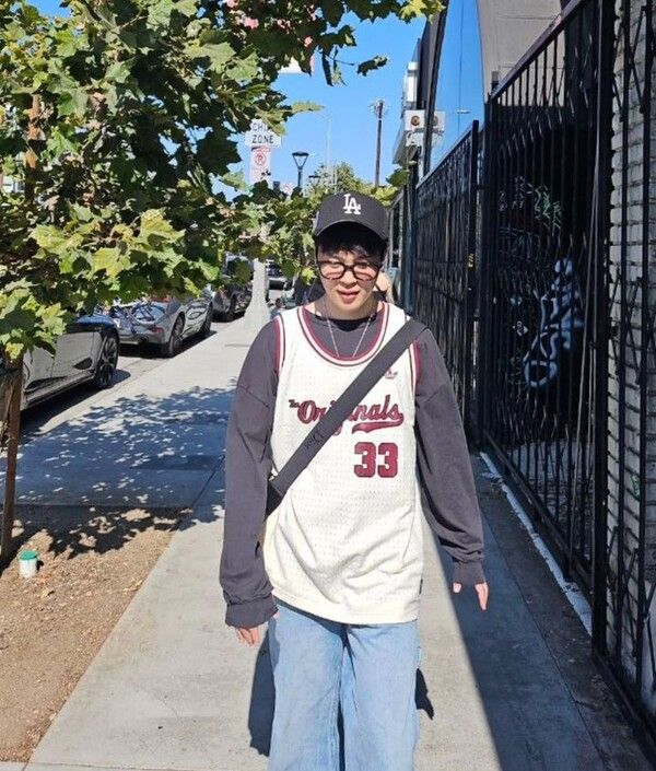 오버핏 긴팔티와 청바지, 농구 저지를 레이어드한 편안한 스타일이 눈길을 끈다.