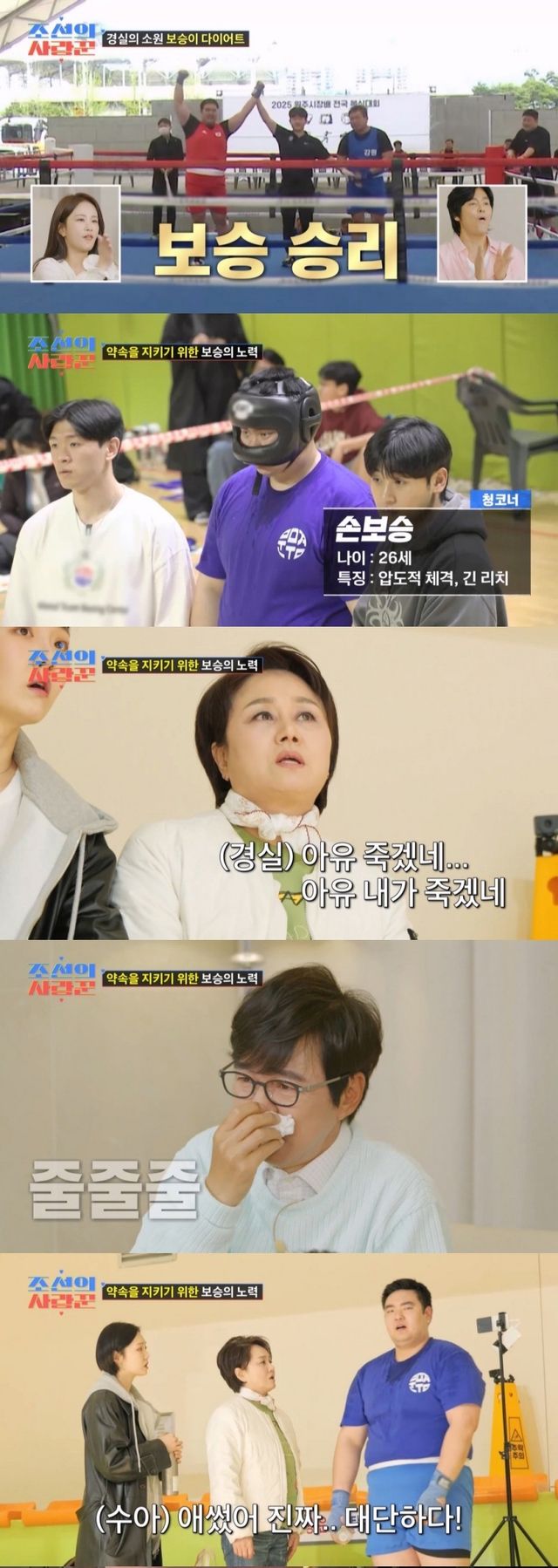 이경실은 "권투로 다져진 몸이었구나 생각하니까 기특하고 대견하다. 보승이 인정이다"면서 엄지손가락을 올렸다.