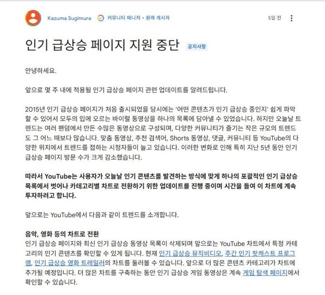유튜브는 인급동 페이지를 없애는 대신 인기 콘텐츠를 보여주는 방식을 새롭게 바꾼다.