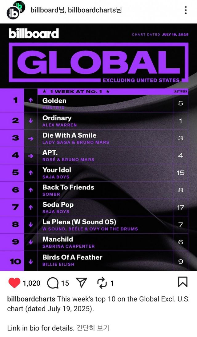 방금 빌보드 200 차트 글로벌 차트 (미국차트 포함) 1위에 헌트릭스 골든이 올랐다고 발표함