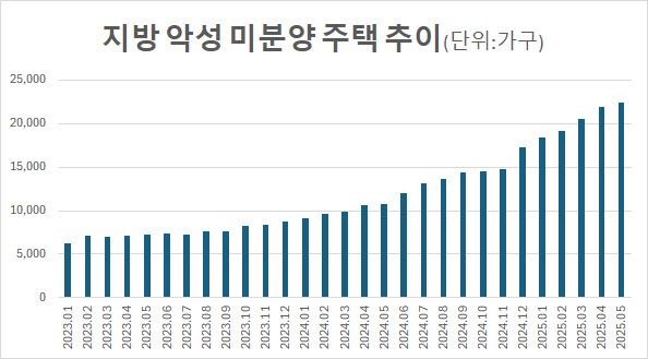 지방 악성 미분양 주택 수는 5월 2만 2397가구로 2011년 10월(2만 3203가구) 이후 13년 7개월래 최대치를 기록하고 있다. 2023년 8월 이후 22개월 연속 증가세다.