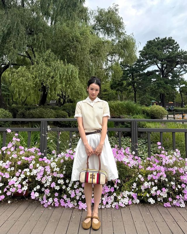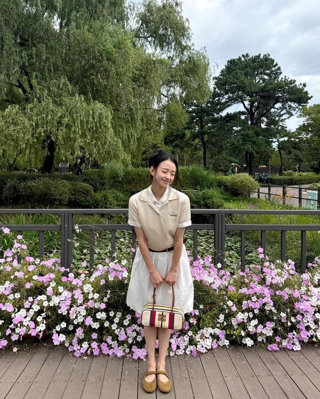 여기에 스트라이프 패턴이 돋보이는 명품 브랜드 핸드백과 라운드 플랫슈즈를 더해 클래식하면서도 사랑스러운 분위기를 완성했다.