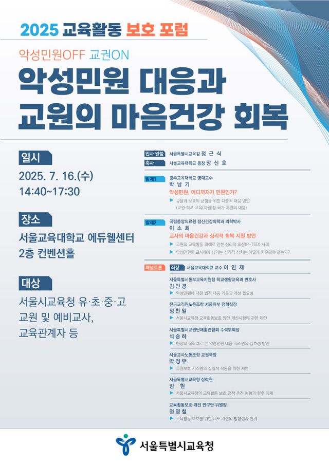 이번 포럼은 교사들이 악성민원과 부당한 요구로 겪는 심리적 소진을 해결할 대책을 논의하기 위해 마련됐다. 행사에는 교원과 예비교사, 교육 관계자 약 200명이 참석하며 교육활동보호와 심리·법률 분야의 전문가, 현장 교원들이 발표자와 토론자로 나선다.
