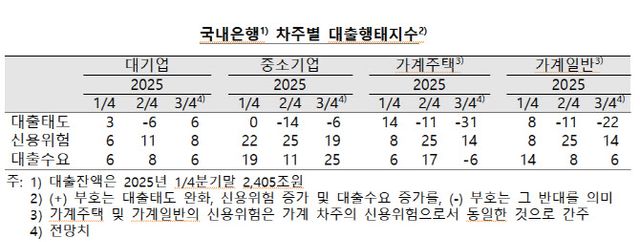 기업대출 태도는 대기업과 중소기업이 대조적이다. 기업대출은 중소기업은 2분기 -14에서 3분기 -6으로 대출 심사 강화 기조가 이어지는 반면, 대기업은 같은 기간 -6에서 6으로 완화될 전망이다.