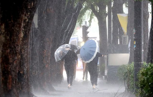 폭우 속에 시민들이 우산을 쓰고 걷고 있다. 기사 이해를 돕기 위한 자료 사진. 16일과 목요일인 17일 사이에 국지적으로 매우 거센 비가 쏟아질 것으로 예상된다고 기상청은 밝혔다. 중부지방 서쪽 지역을 중심으로 16일 오후부터 비가 최대 시간당 30∼50㎜씩 내리겠으니 피해가 없도록 대비해야 한다. 16일부터 내리는 비는 좁은 지역에 매우 강하고 많이 내리는 형태로 저지대 침수와 하천 범람, 급류 등에 각별히 유의해야 한다고 기상청은 당부했다. / 뉴스1