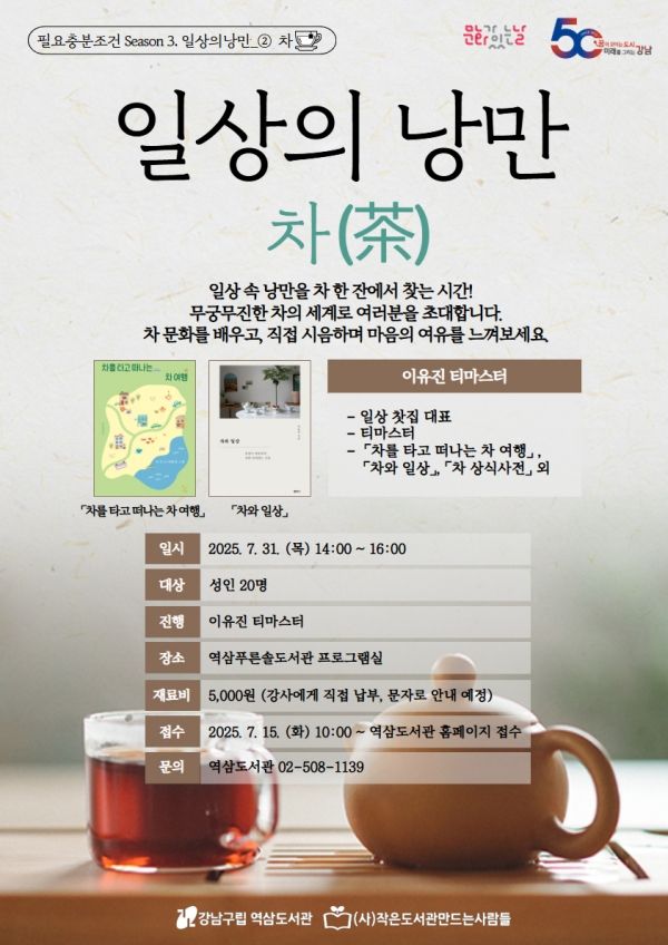강남구립역삼도서관이 문화가 있는 날을 맞아 오는 31일 오후 2시 ‘필요충분조건 Season.3 일상의 낭만 ②_차(茶)’를 진행한다.