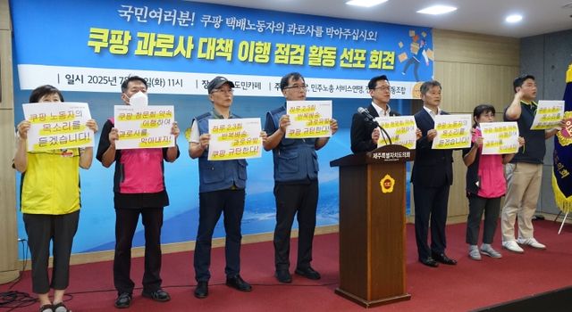 민주노총 서비스연맹 전국택배노동조합과 진보당 제주도당 등은 15일 제주도의회 도민카페에서 기자회견을 열고 ‘쿠팡 과로사 대책 이행점검단’ 활동을 시작한다고 밝혔다.