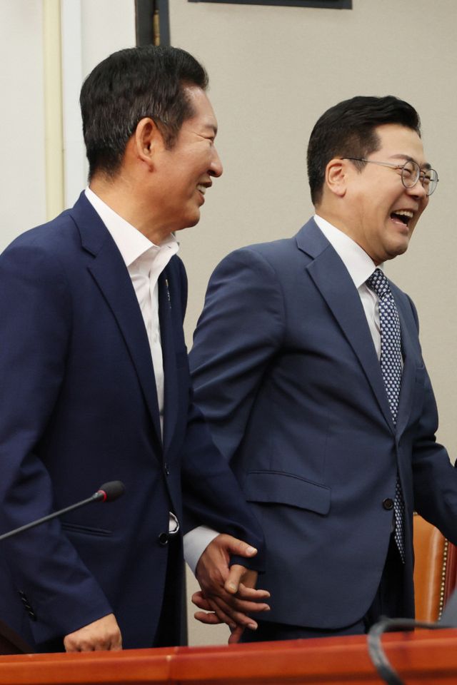 정청래·박찬대(오른쪽) 더불어민주당 당 대표 후보가 15일 서울 여의도 국회에서 공명선거 실천 서약식을 마친 뒤 손을 잡고서 대화하고 있다. ⓒ 연합뉴스